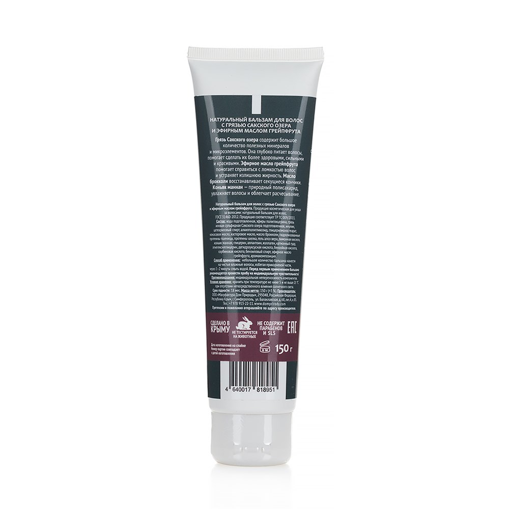 СОСТАВ: вода подготовленная, эфиры полиглицерина, грязь иловая сульфидная Сакского озера подготовленная, инулин, цетеариловый спирт, алкилполигликозид, глицерилмоностеарат, кокосовое масло, касторовое масло, масло брокколи, гидролизованные протеины пшеницы, протеины шелка, гель алоэ вера, лимонная кислота, коньяк маннан, глицерин, аллантоин, коллаген, катионный гуар, этилгексилглицерин, дегидроуксусная кислота, бензойная кислота, сорбиновая кислота, бензиловый спирт, эфирное масло грейпфрута, аромакомпозиция.