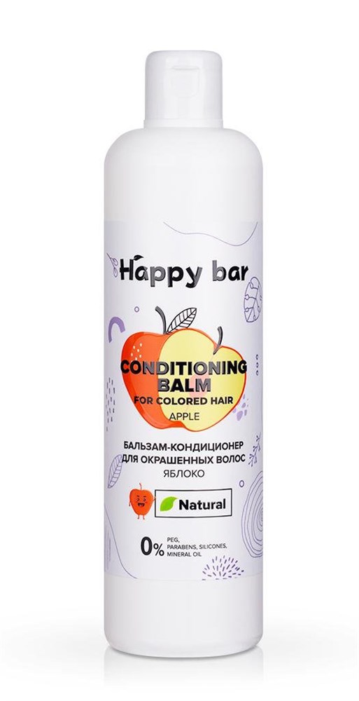 СПОСОБ ПРИМЕНЕНИЯ: Равномерно распределите бальзам по влажным волосам. Оставьте на 3 минуты, затем смойте теплой водой. Рекомендуется применять совместно с шампунем для окрашенных волос Happy bar для достижения лучшего результата.