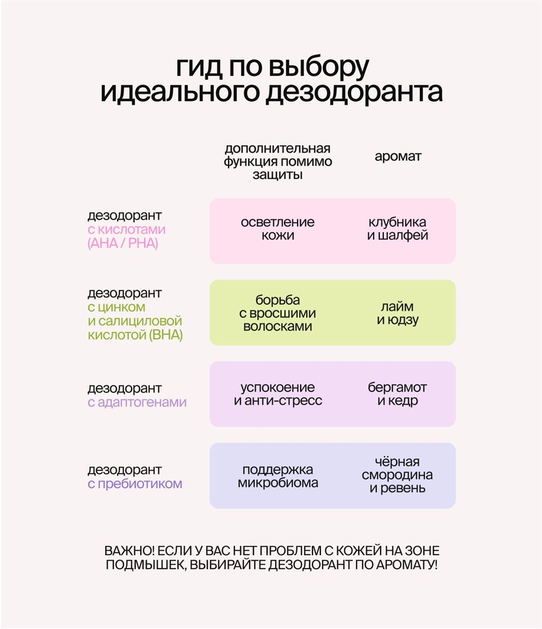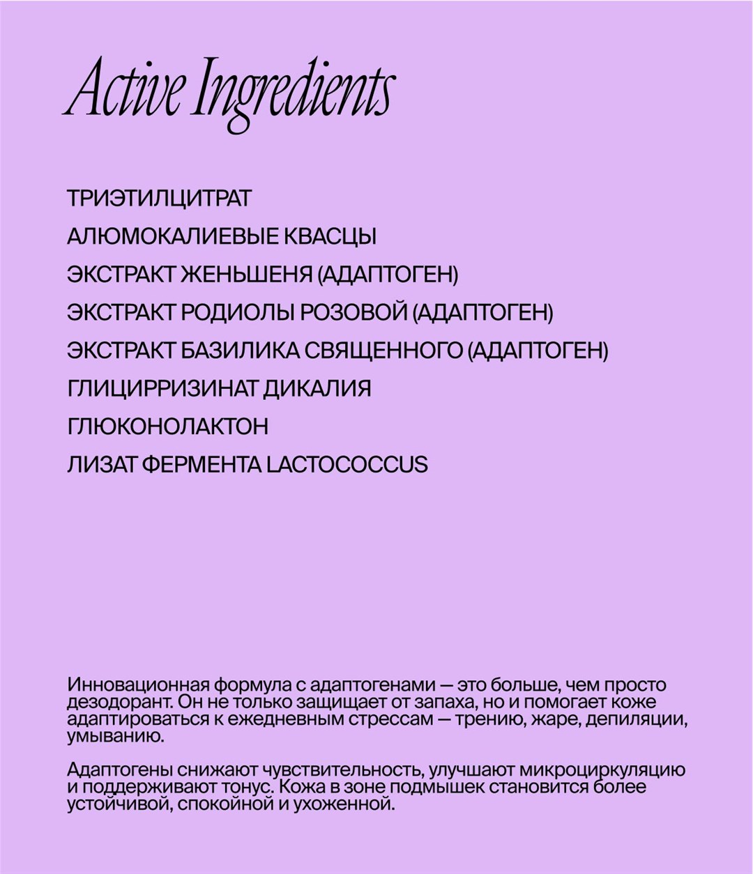 Адаптогены — растительные экстракты, которые помогают коже справляться со стрессами: жарой, трением, умыванием, депиляцией. Они снижают чувствительность, улучшают микроциркуляцию и поддерживают тонус. Кожа в зоне подмышек становится более устойчивой, спокойной и ухоженной.