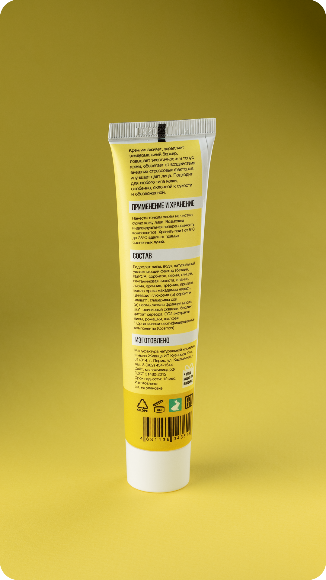 СОСТАВ: гидролат липы, вода, натуральный увлажняющий фактор (бетаин, NaPCA, сорбитол, серин, глицин, глутаминовая кислота, аланин, лизин, аргинин, треонин, пролин), масло ореха макадамии нераф., цетеарил глюкозид (и) сорбитан оливат*, глицериды сои (и) неомыленная фракция масла ши, оливковый сквалан, биолин*, цитрат серебра, СО2 экстракты липы, ромашки, шалфея и тепло наших рук! * органически-сертифицированные компоненты (Cosmos)
