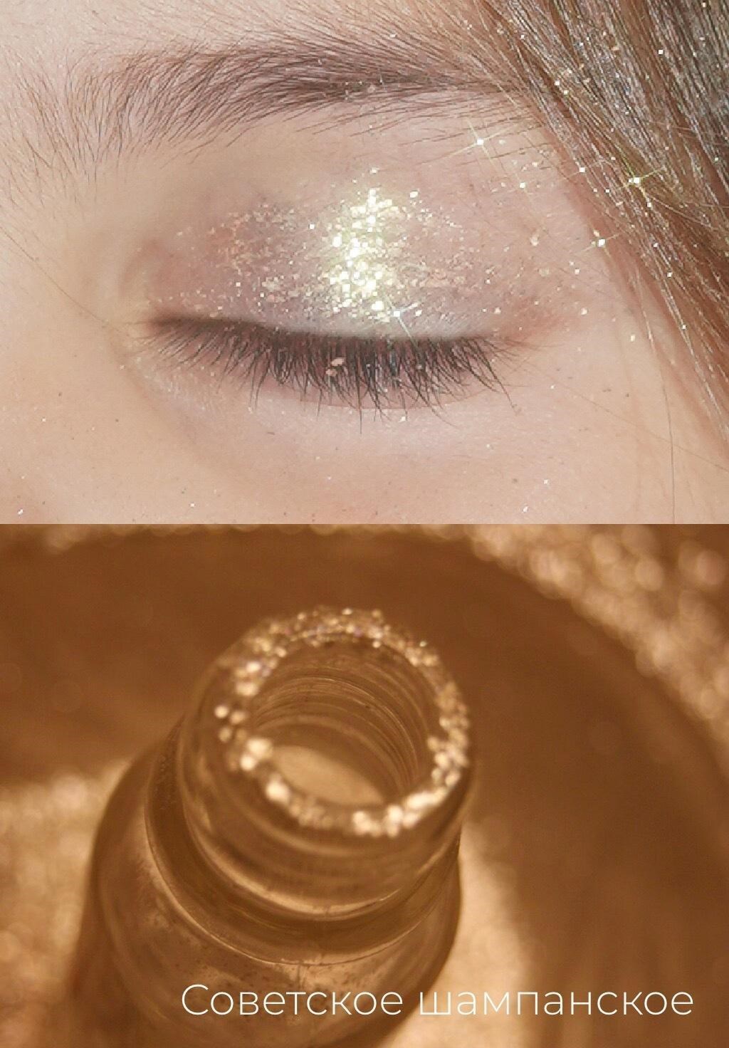 «Советское шампанское» — золотистое мерцание. Тёплое мерцание создаёт игру света на коже и искрится пузырьками в бокале и бенгальскими огнями.