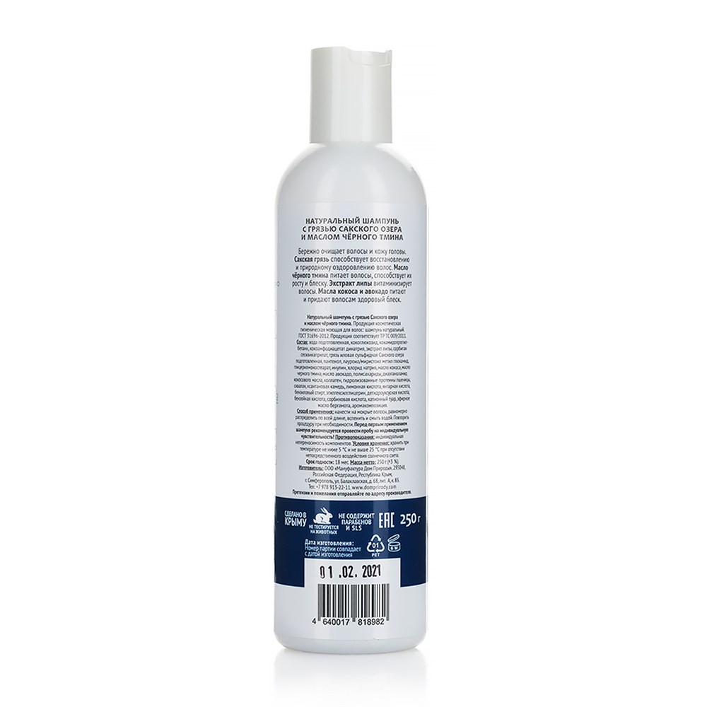 Натуральный шампунь с грязью Сакского озера и маслом черного тмина бережно очищает волосы и кожу головы. Лечебная грязь содержит высокую концентрацию активных веществ – витаминов и микроэлементов, способствует восстановлению и природному оздоровлению волос.