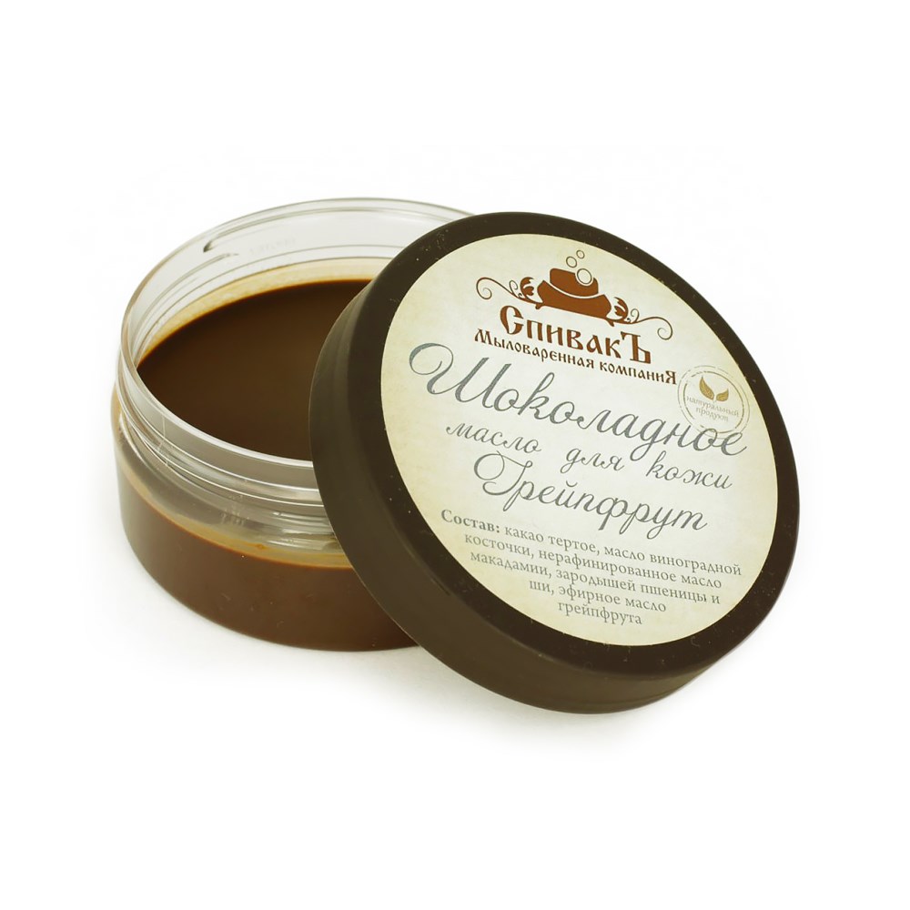 Шоколадное масло для кожи Грейпфрут - питательная масляная смесь на основе какао-тертого со сладким запахом шоколада и грейпфрута. Питает и смягчает кожу, делает её более упругой. Эфирное масло грейпфрута способствует нормализации работы сальных желез, сужению пор.