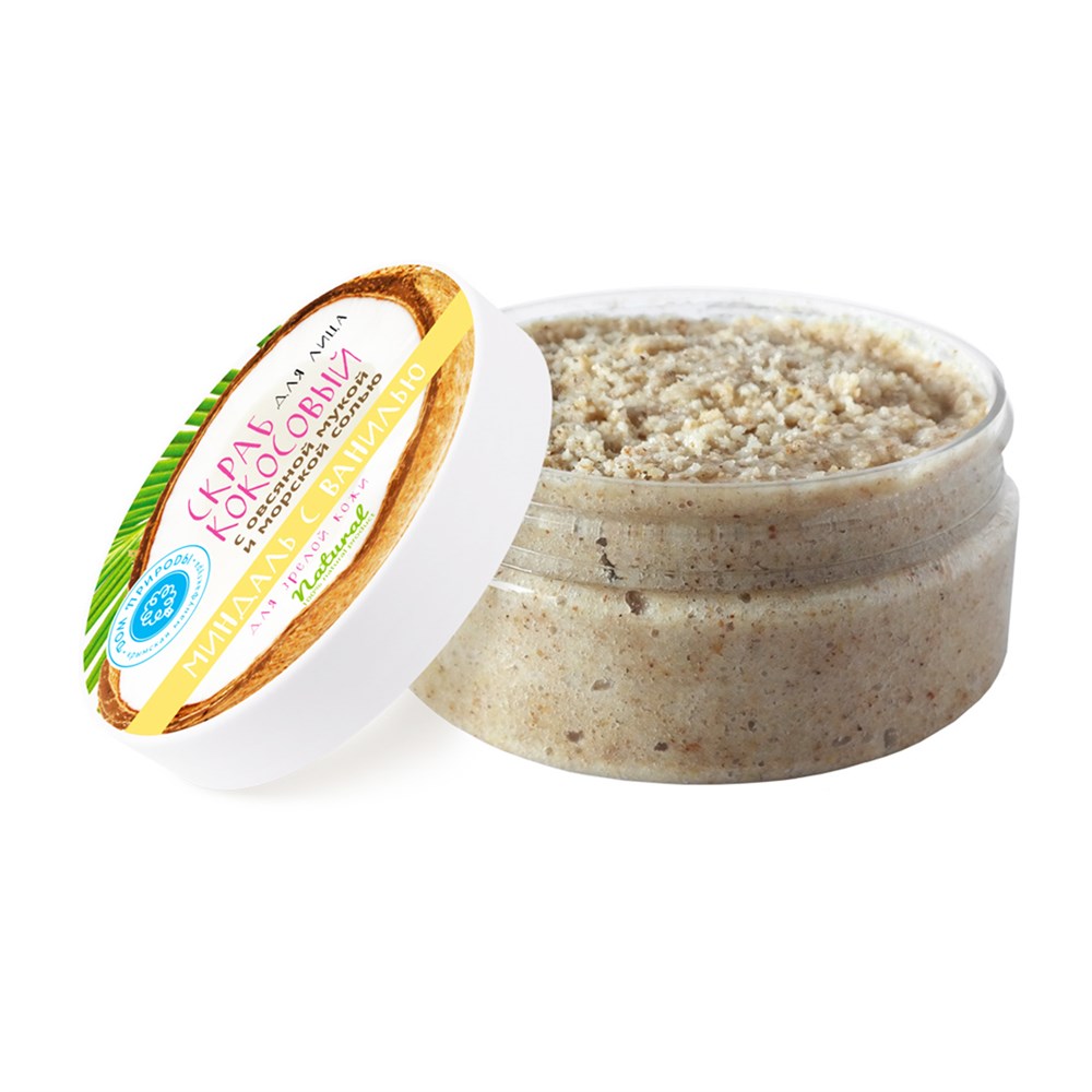 СОСТАВ: мука овсяная, стружка кокосовая молотая, соль морская, масло кокосовое, масло миндальных косточек, глицерил моностеарат, кокоглюкозид, лецитин, глицерин, янтарная кислота, молотая миндальная косточка, пантенол, масляный экстракт ванили, каприк/каприлик триглицерид, сорбитан каприлат, витамин Е.
