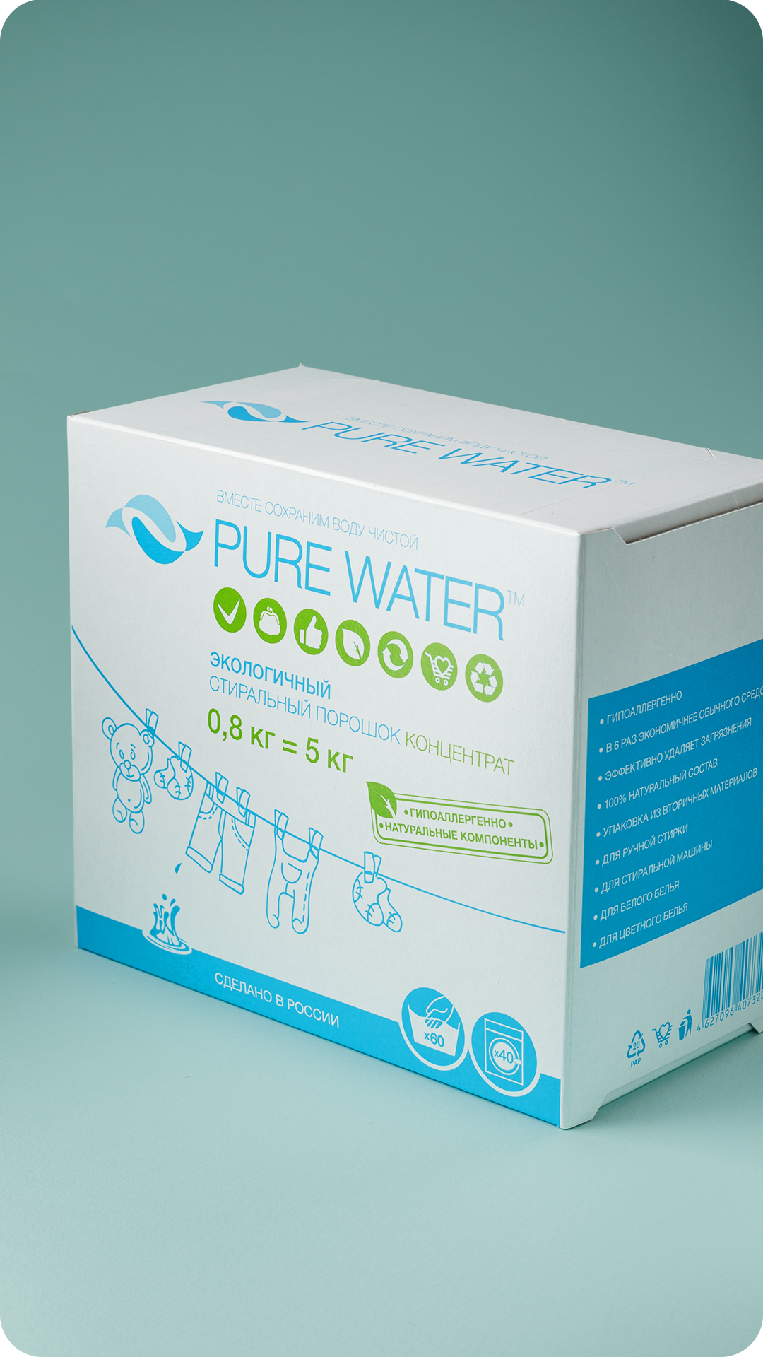 1 кг натурального стирального порошка PURE WATERТМ заменяет 6 кг обычного порошка.