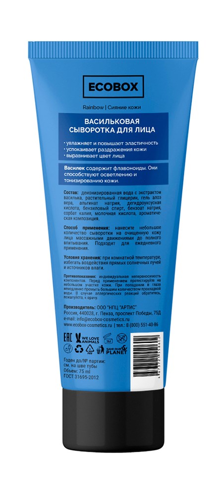 СОСТАВ: деионизированная вода с экстрактом василька, растительный глицерин, гель алоэ вера, альгинат натрия, дегидроуксусная кислота, бензиловый спирт, бензоат натрия, сорбат калия, молочная кислота, ароматическая композиция.