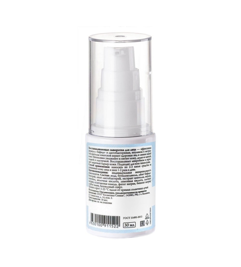 Восстанавливающая сыворотка для лица с пребиотиками и экстрактом центеллы азиатской и комплексом лизатов интенсивно восстанавливает микробиом и укрепляет защитный барьер кожи. Повышает упругость и эластичность, сокращая несовершенства кожи. Активный комплекс лизатов проникает в глубокие слои кожи и воздействует на дерму изнутри. Глубоко увлажняет и повышает местный иммунитет. Сыворотка может применяться для профилактики и повышения стойкости кожи к неблагоприятным факторам, а также в качестве лечения с целью восстановления кожи.